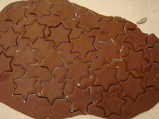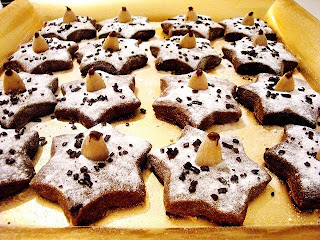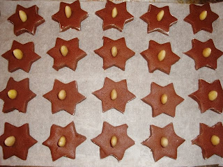 Penasto umutiti margarin sa secerom u prahu i vanila secerom, dodati kakao i mlevene lesnike,izmesati pa dodati i brasno. Sve zajedno umesiti u glatko testo. Na dasci posutoj brasnom rastanjiti testo na 5 mm. debljine, vaditi kalupom zvezdice i redjati ih u tepsiju na papir za pecenje. U svaku zvezdicu utisnuti jedan badem. Peci u zagrejanoj rerni na 180 stepeni oko 15 minuta. Pecene ostaviti nekoliko minuta u tepsiji da se prohlade pa ih tek onda vaditi. Na vrh badema staviti kap otopljene cokolade.
